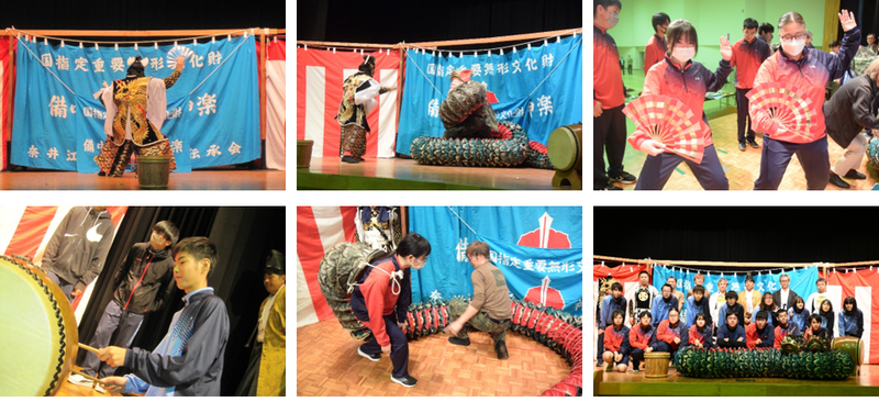 10月10日(金)奈井江町と岡山県高梁市(旧成羽町)の友好都市提携を機会に、文化交流の一環として発足した、奈井江町備中神楽伝承保存会の皆様を講師として、備中神楽の見学・体験学習を実施しました。実際の演舞を見学した後、備中神楽の歴史や実際に使用している道具の説明と体験をさせていただきました。2学年は見学旅行で高梁市を訪問するので、とても参考になりました。